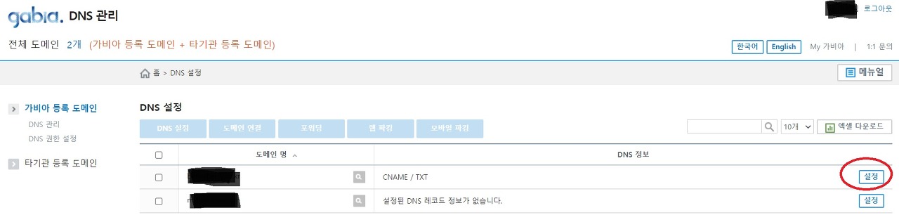 6) 지금 설정을 해야하는 도메인의 오른쪽 설정 버튼을 눌러주세요.