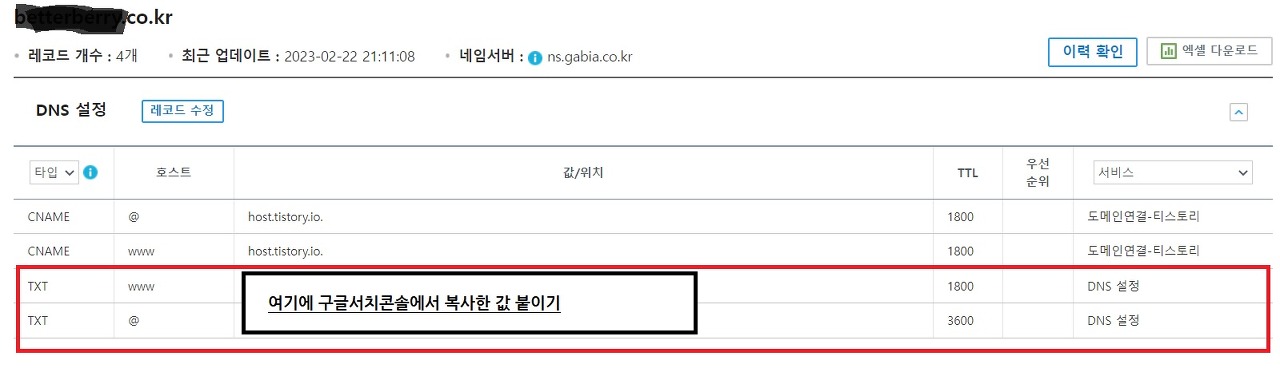 그러려면 도메인을 구입한 호스트 홈페이지에 가서 아래 TXT를 붙여넣어 소유권을 확인받아야 해요.