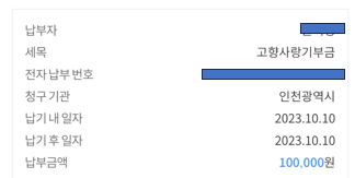 : 공과금 → 지방세 → 세외수입 납부하기 → 고향사랑 기부금 10만원 선택하여 납부