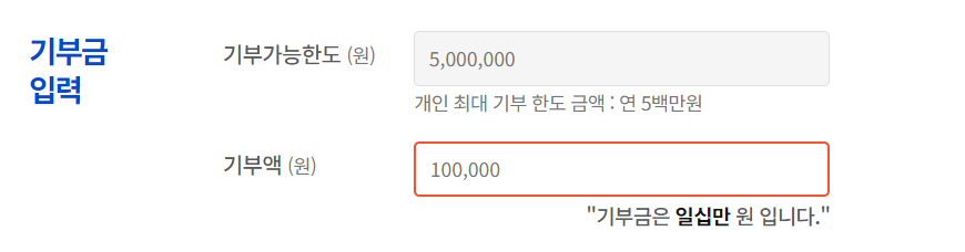 기부 한도는 5백만원까지 가능하지만, 10만원 하시면 세액 공제를 전체 다 받으실 수 있습니다.