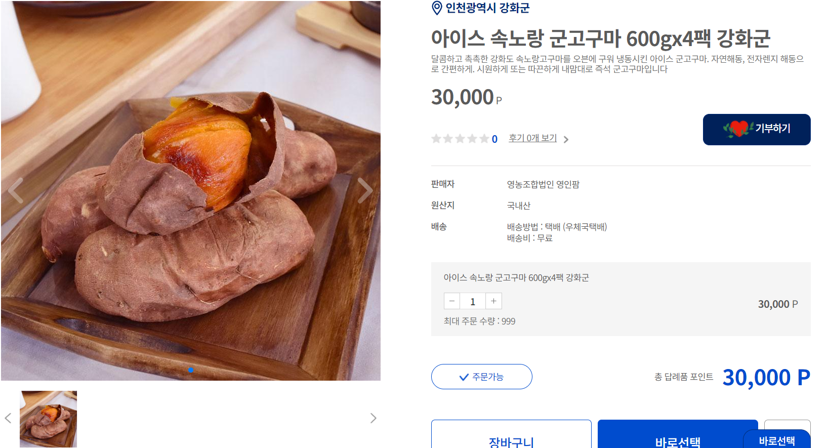 강화군은 선택할 필요가 없어요....맛있는 속노랑 군고구마 600g짜리 4팩이 답례품입니다.