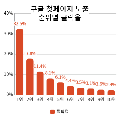 첫번째 페이지에서도 구글 검색 노출 상위 1위가 해당 검색에서 발생한 클릭의 32.5%를 점유한다.