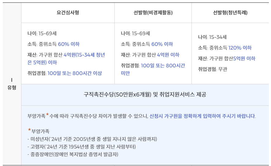 - 저소득층 소득 지원 강화 : 구직자 취업촉진 및 생활안정지원에 관한 법률」을 근거하여 저소득 구직자 등 I유형 참여자에게 구직촉진수당(월50만원×6개월+부양가족* 1인당 10만원씩 월 최대 40만원 추가지원)을 지급 → 저소득층의 생계 안정을 지원 (구직촉진수당 지급주기 중 미성년자(만 18세이하), 고령자(만 70세이상), 중증장애인(장애인복지법 상 증명서 발급자) 해당자)