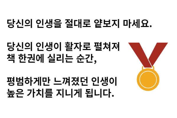 당신의 인생이 활자로 펼쳐져 책 한권에 실리는 순간, 평범하게만 느껴졌던 인생이 높은 가치를 지니게 됩니다.