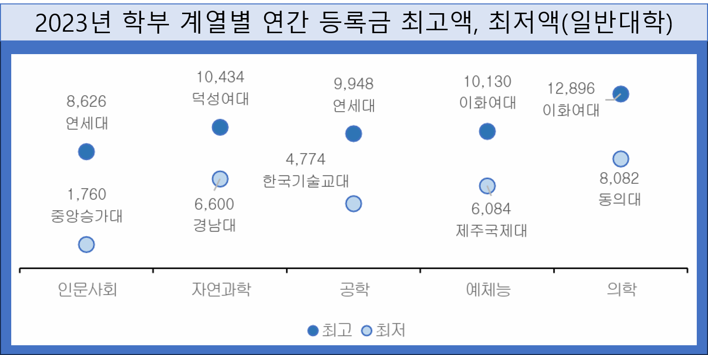 사단법인 대학교육연구소에서 발표한 '대학생 삻의 비용에 관한 리포트 Ⅱ'에 의하면, 일반 사립대학 1학년 연간 등록금은 자연과학계열 806만 원, 공학계열 853만 원, 예체능계열 843만 원으로 800만원대였으며, 의학계열이 1,050만 원으로 가장 비쌌다. 인문사회 계열은 671만 원으로 가장 낮은 수준이다.
