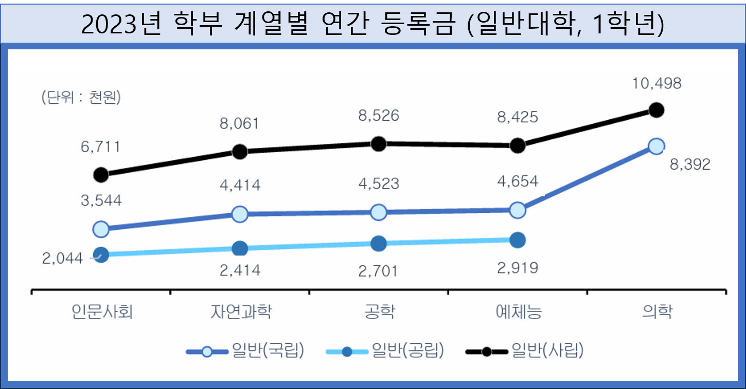 사단법인 대학교육연구소에서 발표한 '대학생 삻의 비용에 관한 리포트 Ⅱ'에 의하면, 일반 사립대학 1학년 연간 등록금은 자연과학계열 806만 원, 공학계열 853만 원, 예체능계열 843만 원으로 800만원대였으며, 의학계열이 1,050만 원으로 가장 비쌌다. 인문사회 계열은 671만 원으로 가장 낮은 수준이다.