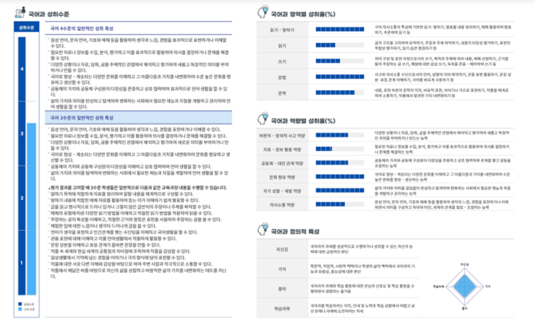 특히, 각 과목별 영역별 성취도와 역량별 성취도는 아이의 학업 수준을 객관적으로 판단할 수 있게 해주고, 아이가 어떤 생각으로 학교 생활을 하는지, 각 과목에 대해 얼만큼 흥미를 가지고 있는지 종합적으로 판단해 볼 수 있는 좋은 제도입니다.
