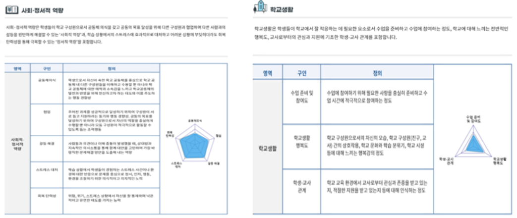 학생들의 과목별 성취도 뿐 아니라, 학교 생활과 사회,정서적 역량에 대해서도 객관적으로 진단하고 판단할 수 있는 좋은 평가 도구인 것으로 보입니다.