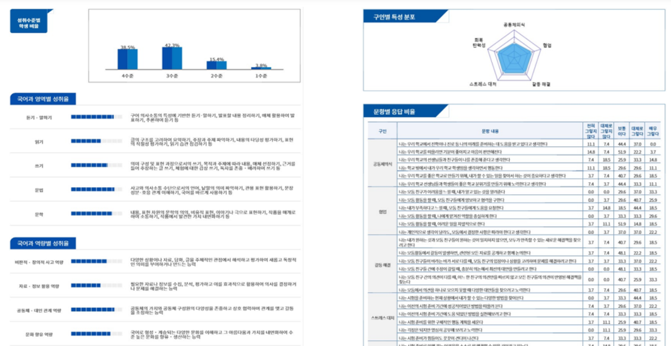 - 각 학급의 과목별 영역별, 역량별 진단 결과를 제공하며, 구성원 특성에 대한 진단 결과도 제공합니다.