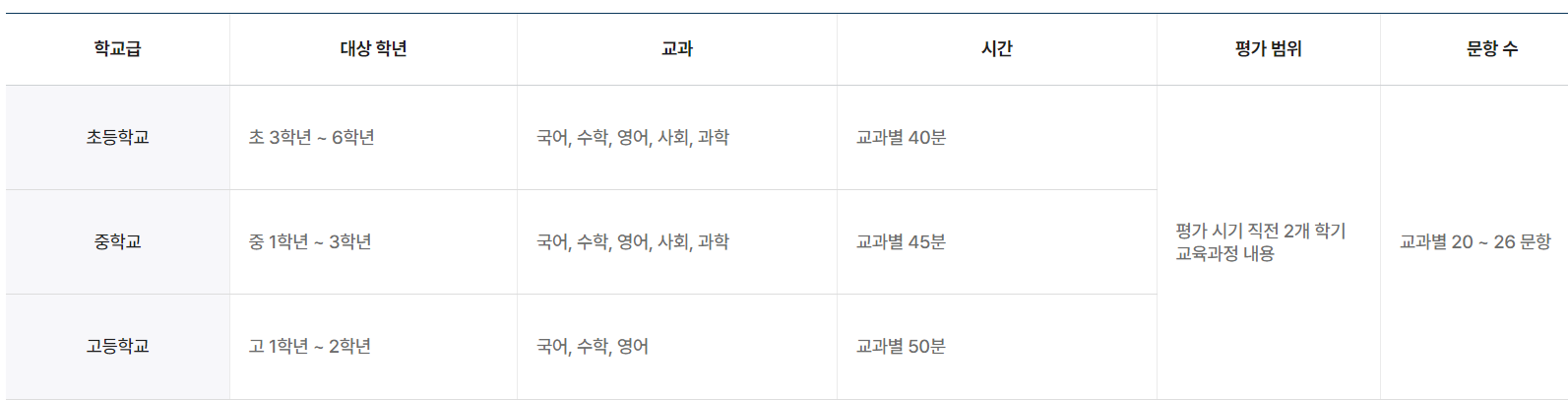- 초등학교는 3학년~6학년 대상으로 국어, 수학, 영어, 사회, 과학 5개 과목의 평가를 시행할 수 있습니다.