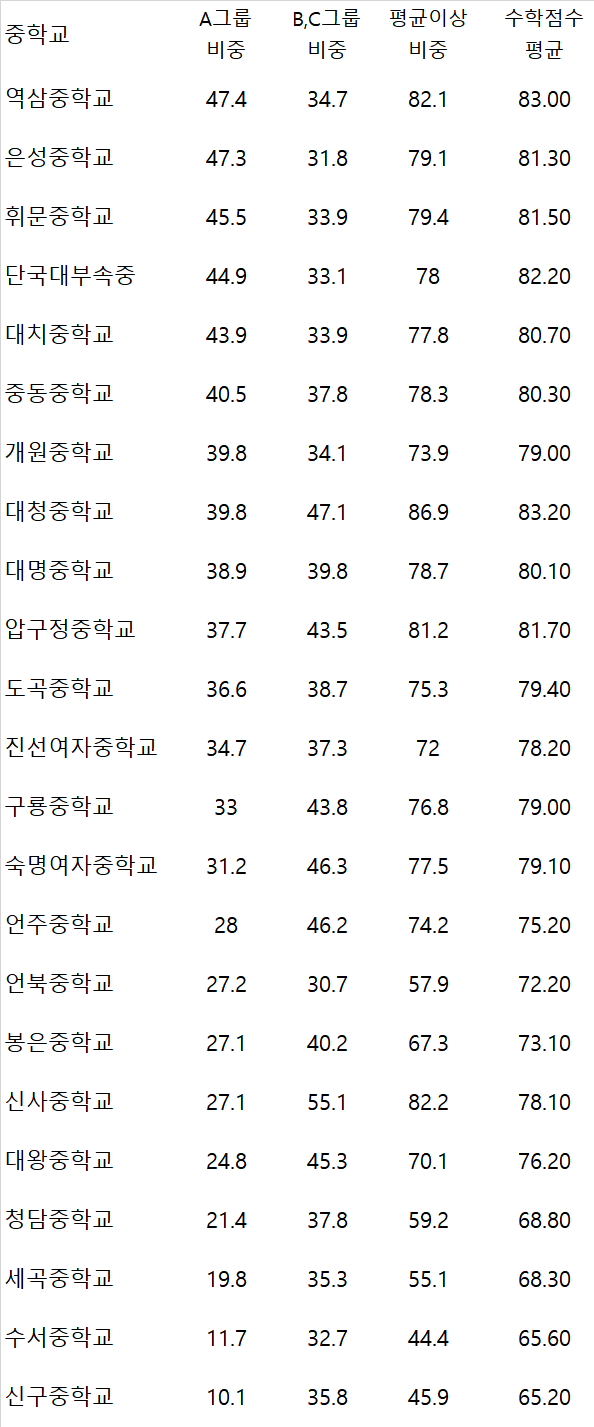 수학 최상위 그룹 비중이 가장 높은 학교는 역삼중47.4%, 은성중 47.3%, 휘문중 45.5%, 단국대부중 44.9%, 대치중 43.9%, 중동중 40.5% 순입니다.