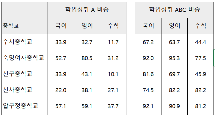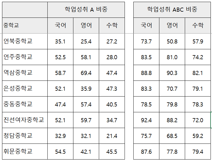 우리나라에서 교육열이 가장 높은 서울시 강남구 중학교별 학업 성취도를 모두 조회해서 표로 만들어 봤습니다.