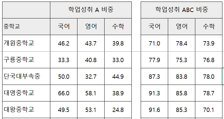 우리나라에서 교육열이 가장 높은 서울시 강남구 중학교별 학업 성취도를 모두 조회해서 표로 만들어 봤습니다.