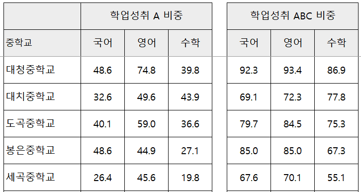 점수가 아니라 보통 이상 학업성취를 보인 학생의 비율이라는 점을 감안해서 확인해 주세요