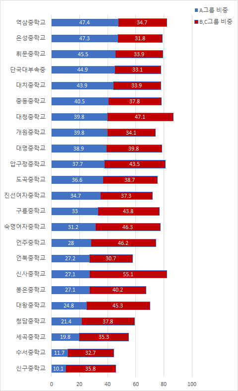 대청중학교와 도곡중학교가 상위권 비중이 높은 편입니다. 대청중학교의 영어 A그룹 상위권 비중은 무려 74.8%입니다.