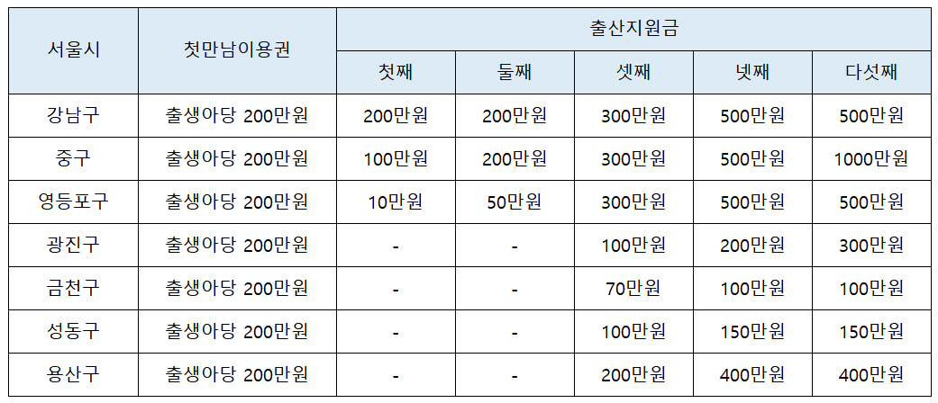 이외의 구는 정부에서 지급하는 첫만남 이용권(출생아당 200만원)만 지원한다고 이해하시면 될 것 같습니다.