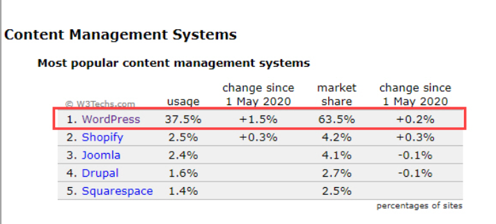 2020년 5월 현재 전세계 모든 웹 사이트의 37.5%는 워드프레스를 사용하고 있고 지속 확대 되고 있습니다. 쇼피파이, 줌라, 두루팔 등이 그 뒤를 잇고 있습니다.