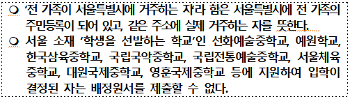 - 중학교 배정 이후 전 가족이 타 시,도에서 서울로 이사온 경우, 또는 서울시 내에서 거주지 변경으로 학군지 변경이 일어난 경우, 재배정 신청 기간내에 반드시 신청해야 한다.