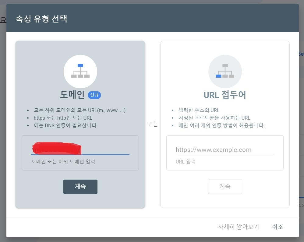구글 서치콘솔에서 블로그 주소 등록을 아직 안하셨다면 도메인만 그냥 등록하면 되지만,