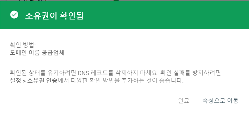 7) 완료 후 구글 서치콘솔에 가면 이렇게 소유권이 확인되었다는 메시지가 뜹니다.