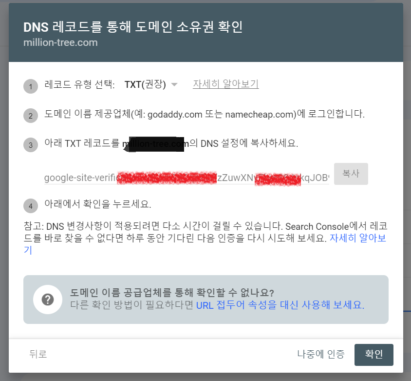 4) 구글서치콘솔에서 속성 추가해서 도메인 등록 속성이 등록되면 소유권 확인하라는 팝업이 떠요.