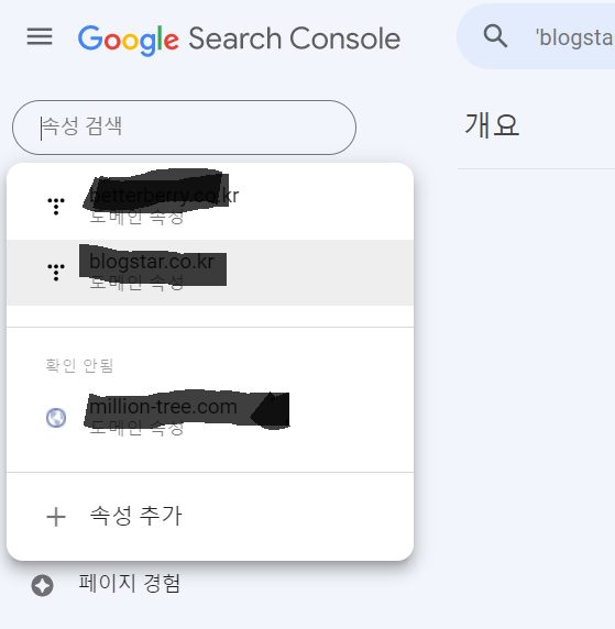 그리고 아까 그 메뉴에서 등록이 완료 되었습니다. 구글 서치콘솔 메뉴 상단에서 해당 도메인 누르시면 바로 이런 화면이 떠요.