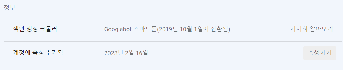 구글서치콘솔의 설정 페이지 상단 이미지 아래로 계속 내리시면 계정에 속성 추가됨.이라고 되어 있고, 오른쪽에 속성제거 버튼이 보이실 거예요.
