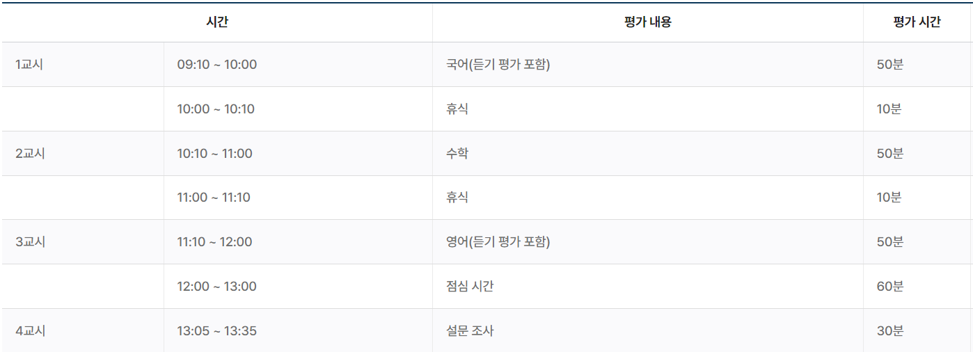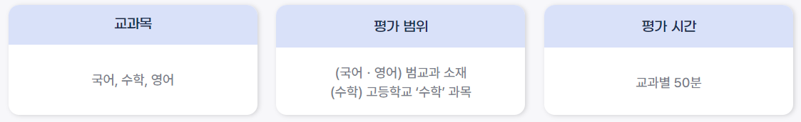- 고등학교 2학년 대상의 평가 과목은 국어, 수학, 영어 3과목입니다.