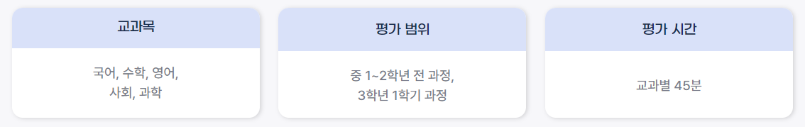 - 중학교 3학년 대상의 평가 과목은 국어, 수학, 영어, 사회, 과학 5과목입니다.