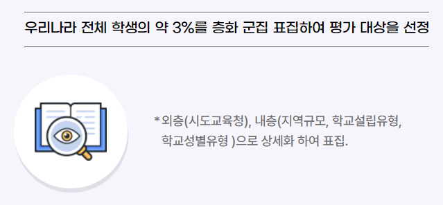 - 전체 학생의 약 3%를 층화 군집 표집하여 평가대상을 선정합니다.