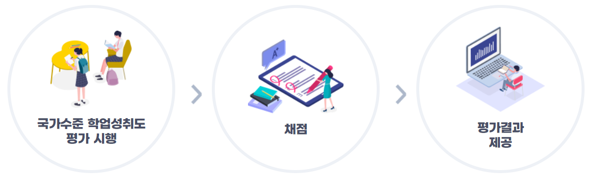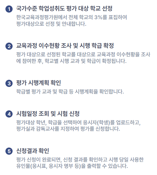 - 국가 수준 학업 성취도 평가는 한국교육과정 평가원에서 평가 대상 학교와 학급을 선정하여 안내하면,