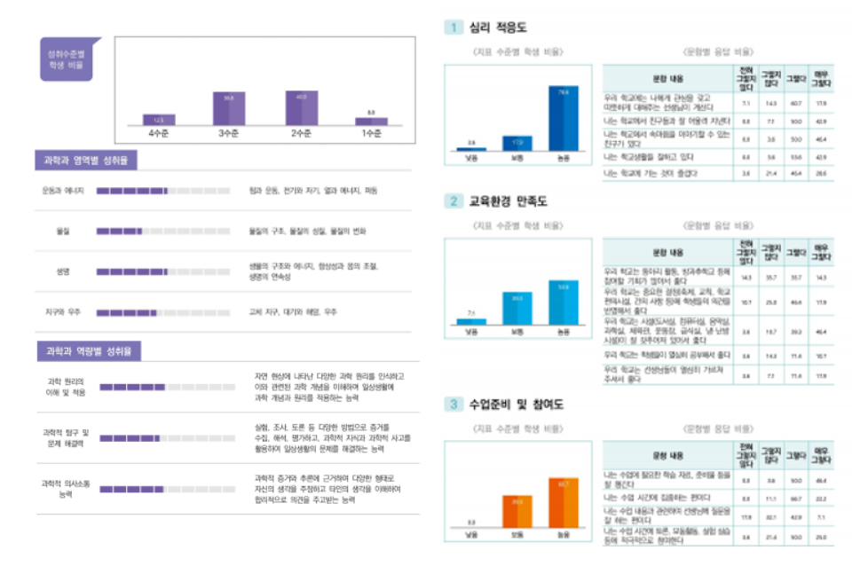 - 결과는 학교 단위로 평가에 참여한 학급 학생들의 성취 특성과 비 인지적 특정에 대해 평균적인 평가 결과를 제공할 뿐만 아니라, 학생별 개별적인 평가 결과도 제공합니다.