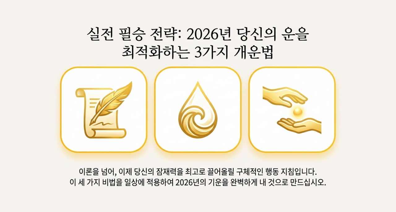 2026년의 폭발적인 에너지는 양날의 검과 같습니다. 이 강력한 힘을 제대로 길들여 타버리지 않고 온전히 내 것으로 만들기 위해서는 전략이 필요합니다. 당신의 성공을 앞당길 3가지 '비밀 병기'를 소개합니다.
