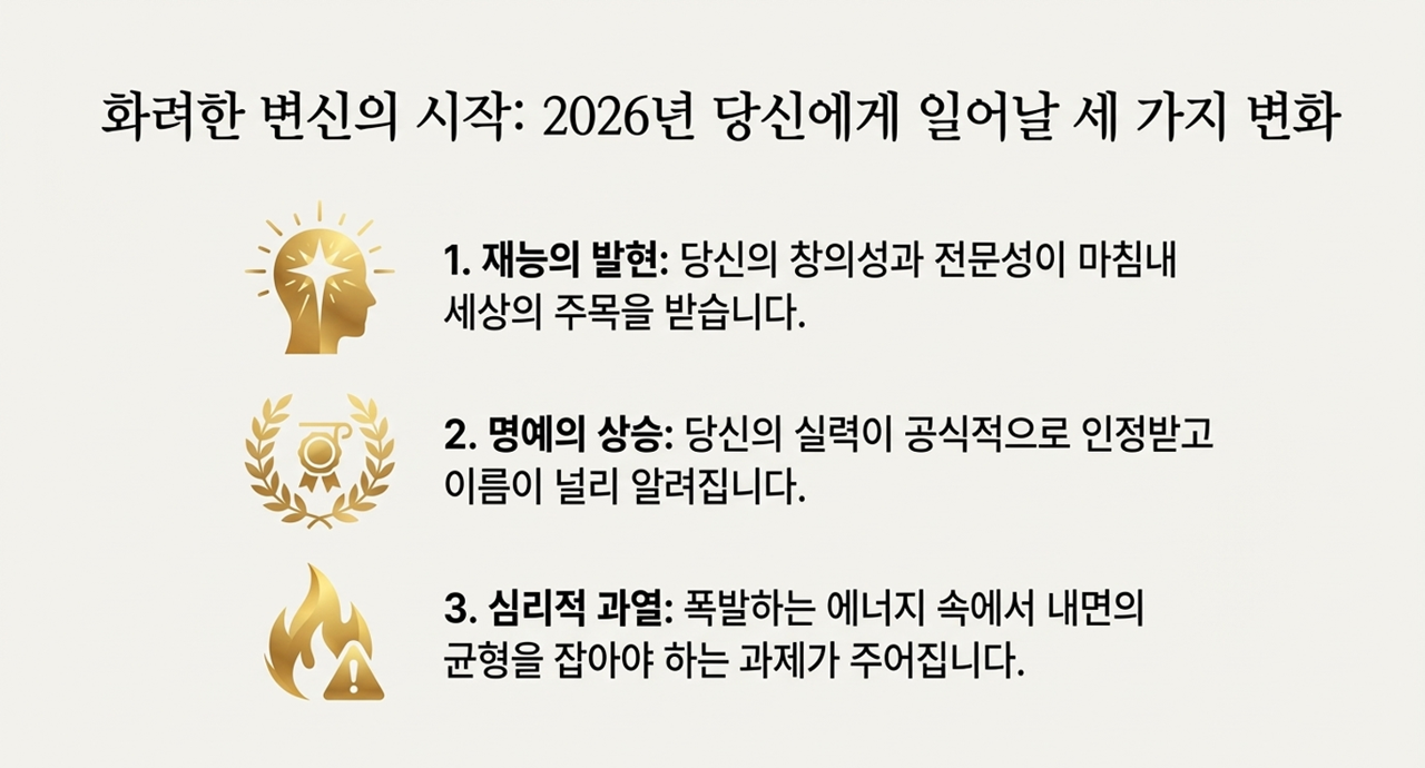 하지만 2026년 병오년(丙午年), 드디어 그 답답한 구름이 걷히고 거대한 태양이 당신을 정면으로 비추는 전환점이 찾아옵니다. 사주 명리학적으로 변화무쌍한 에너지를 지닌 용(辰)이 2026년의 뜨거운 불(丙午)을 만나면, 그동안 쌓아온 에너지가 폭발적으로 발현됩니다.